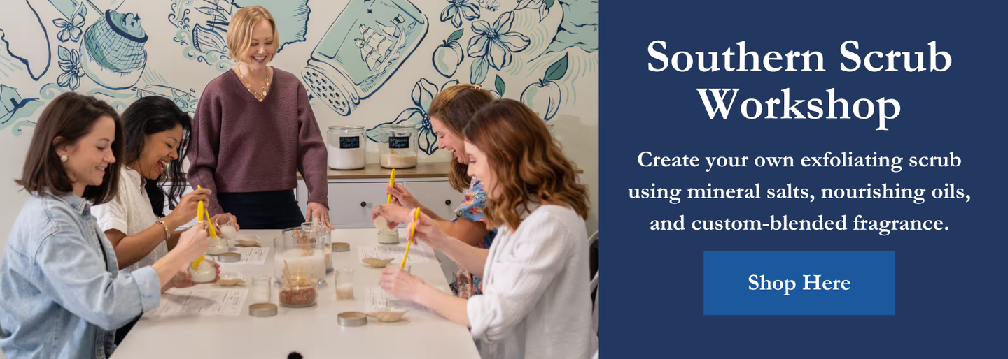 Looking for a unique Savannah experience? We're open for workshops! Join us for a 60-90 minute DIY workshop. Our hands-on courses take place in our gift shop and production facility where you will get a glimpse of every part of our product life cycle from raw ingredients to packaging, learn about the Southern botanicals and fragrances that make up our products. Choose from a Scrub Making Workshop or a Clay Mask Workshop. Self-guided mini sessions are available for drop-in visitors. Just text us to confirm we're open for drop-in visitors.