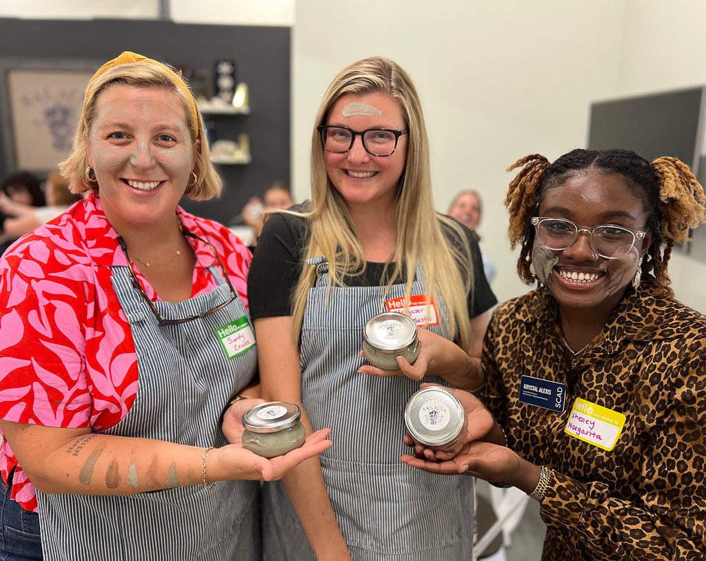 Walk away with a 7oz handmade clay mask in a beautiful glass vessel. If concerned about checking baggage, or carry-on luggage for a flight, we can provide smaller vessels or ship for free with an in-store purchase.