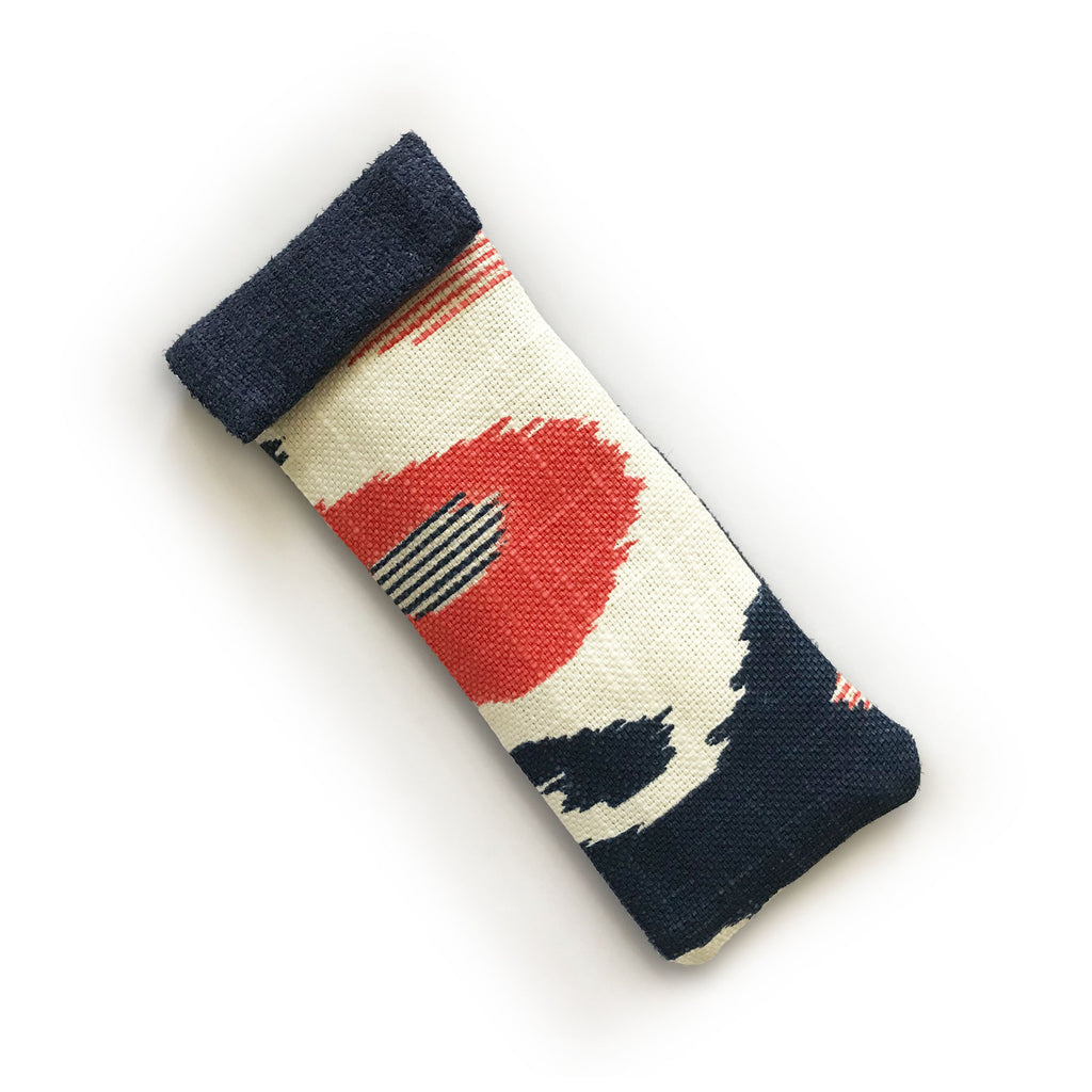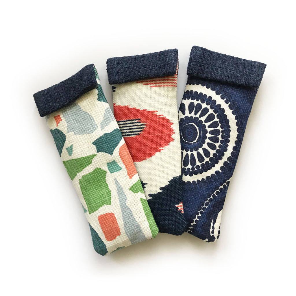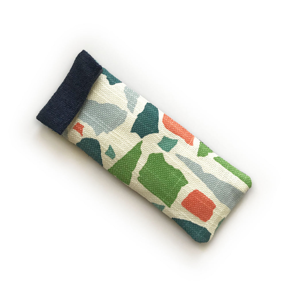 Each unit is one-of-a-kind, made from repurposed fabric swatches. Lined with a soft blue fabric on one side to be placed over the eyes.