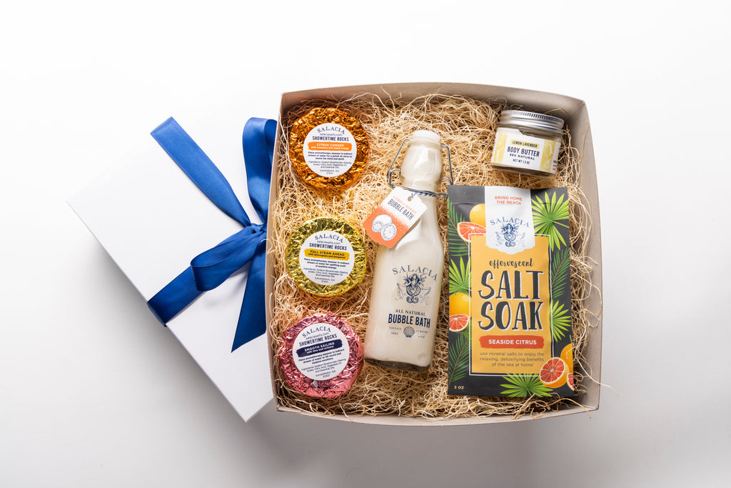 This wellness and skin care package uplifts both the body and spirit! We've paired a decadent coconut-based skin moisturizing bubble bath in Citrus & Sunrays scent, packaged in a beautiful hermetic, reusable bottle with a trio of Shower Steamers, a soothing body butter and a effervescent salt soak.