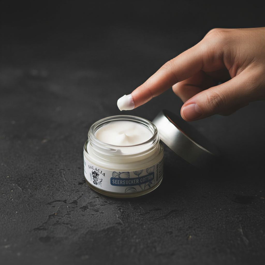 Layer on the fresh scent of cotton - a perfectly refreshing way to soothe dry skin and problem dry areas. Body Butter leaves skin wonderfully smooth and hydrated. Made with Vitamin E and chamomile flower extract, Salacia Body Butters contain 99% natural and 78% organic ingredients.