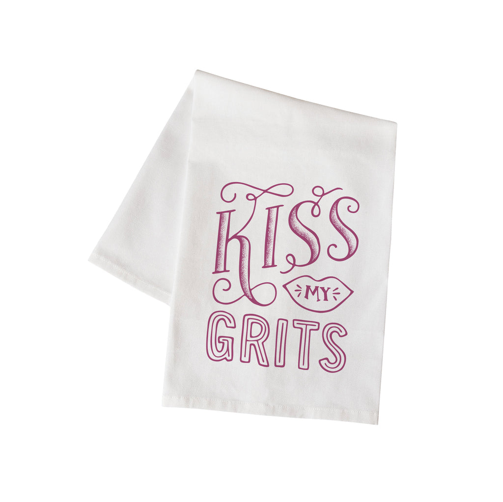 Our 100% cotton guest towel with the sassy Southern phrase KISS MY GRITS measures 30 x 30 inches. Screen printed by hand in Savannah, GA, this cotton towel makes a fun addition to any Southern home - or home away from home. A perfect gift and conversation piece! Pair it with Kiss My Grits Lip Scrub and Kiss My Grits, Sugah! Body Scrub for a gift that will surely bring on some laughs.