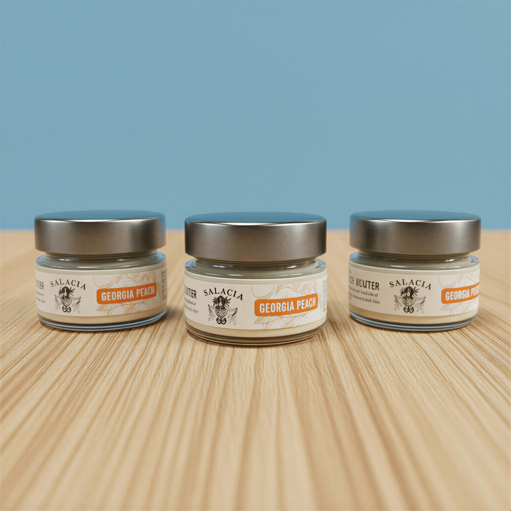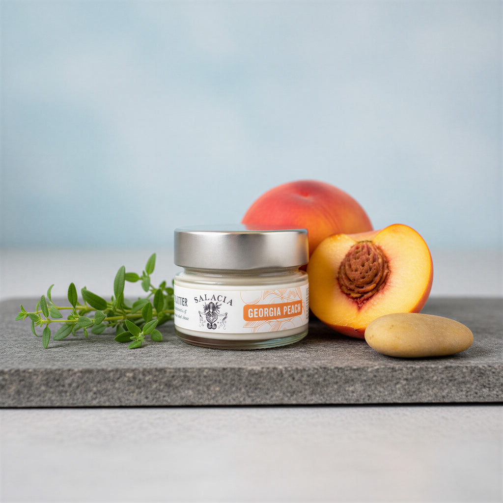 Made with natural beeswax and chamomile flower extract, Georgia Peach Body Butter contains a subtle juicy peach scent — truly reminiscent of the South. Beeswax provides a slight anti-inflammatory and antioxidant qualities which can benefit the body. Beeswax contains natural moisturizers to help keep the skin firm and plump.