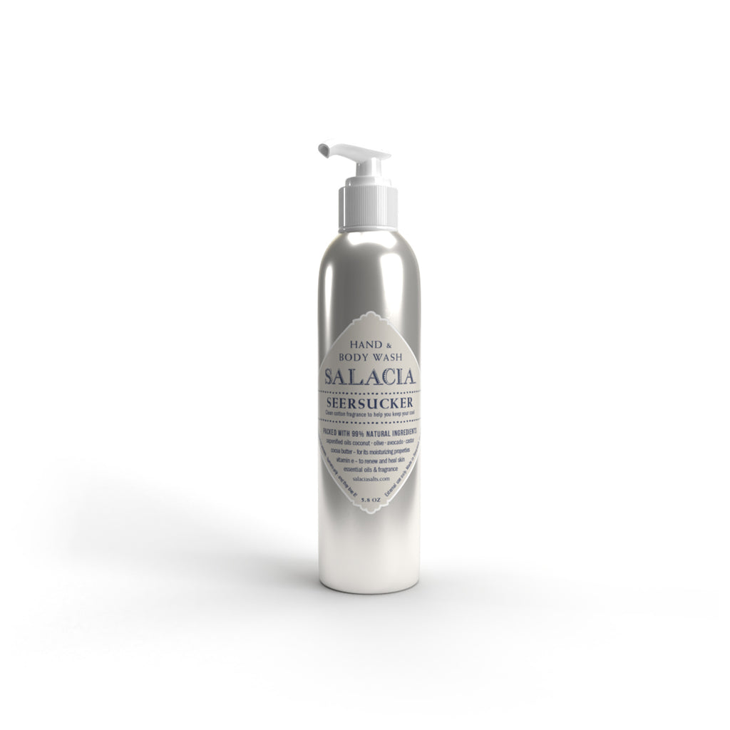 99% natural Seersucker Hand & Body Wash has a clean cotton fragrance and gently washes away dirt and germs!